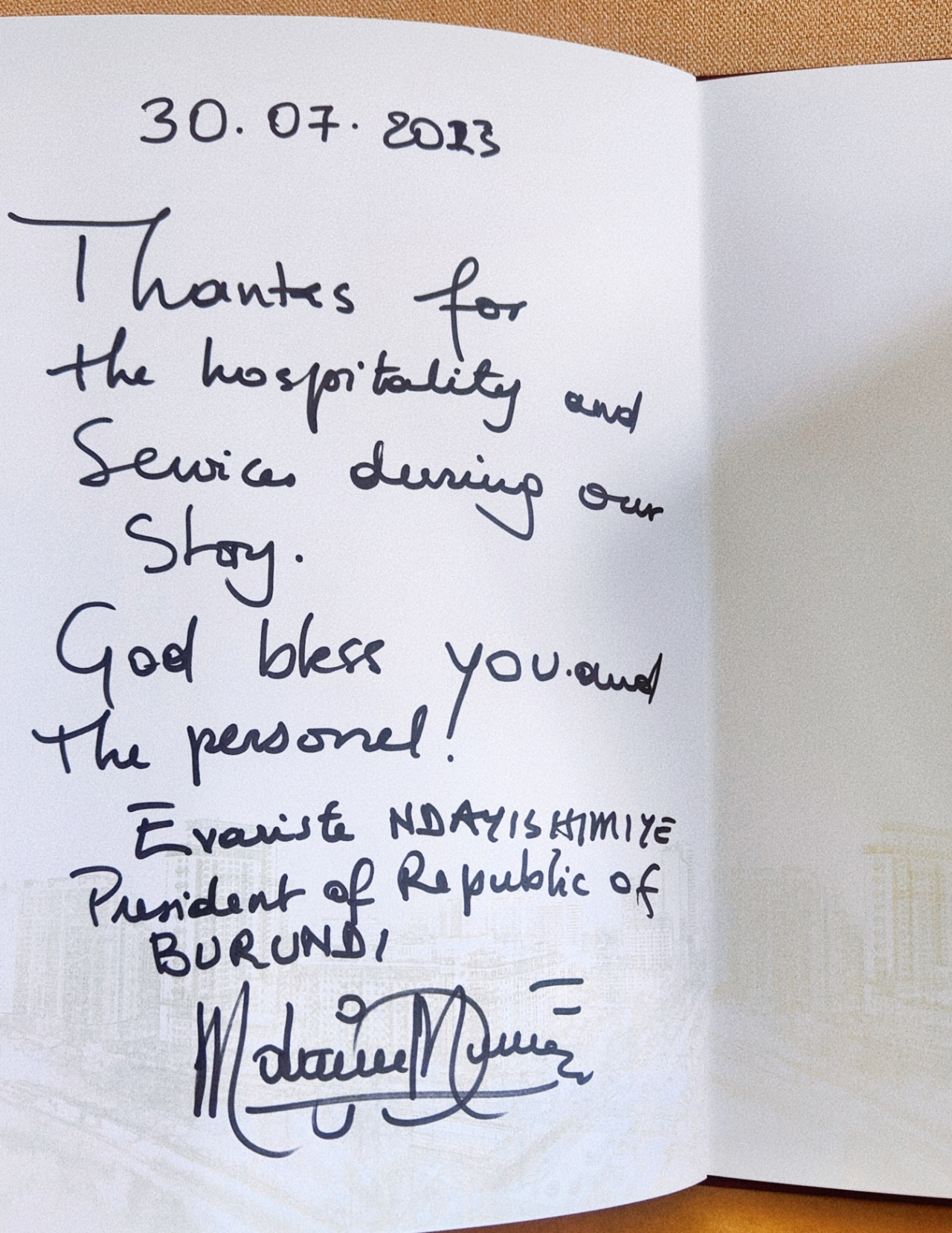 国家向导人及夫人离馆之际,,,,,在金牛宾馆亲热问候了宾馆以党科同志为代表的服务包管团队成员,,,,,表达了对川菜的喜欢,,,,,夸赞川菜“巴适”,,,,,并体现在金牛宾馆可以享用到正宗的川菜,,,,,赞美金牛宾馆是有古板的宾馆。。。。。。布隆迪总统恩达伊施米耶在锦江宾馆留言簿上留言,,,,,体现了对锦江宾馆此次接待的谢谢,,,,,并与接待职员合影留念。。。。。。